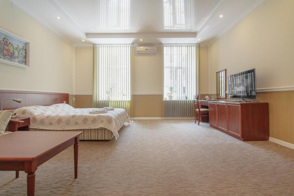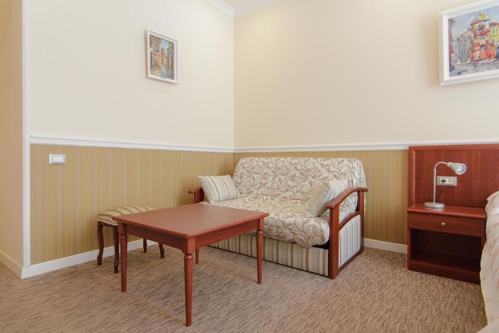 Просторный номер люкс выполнен в классическом стиле, оборудован для Вас двуспальной кроватью и раскладным диваном, телевизором (с кабельным ТВ), холодильником, всей необходимой мебелью и санузлом с душевой, рабочим и кофейными столиками со стульями. Также предусмотрен чайник и другие принадлежности для приготовления кофе и чая, бесплатный доступ к Wi-Fi.